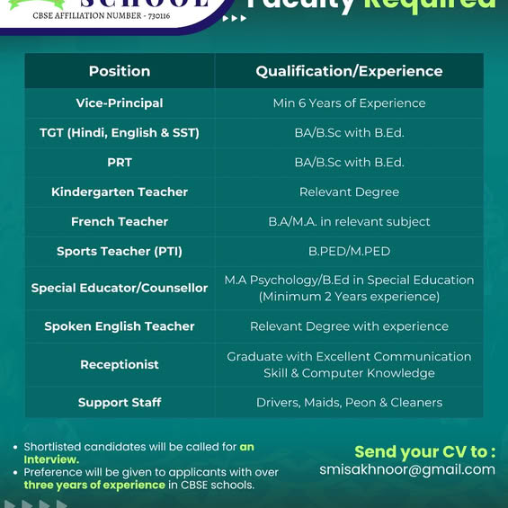 Preference will be given to applicants with over 3 years of experience in CBSE schools.